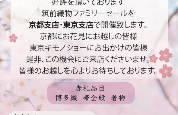 筑前織物の博多織が京都支店に一同に集まります。ぜひこの機会に、筑前織物展示会にお越し下さいませ。