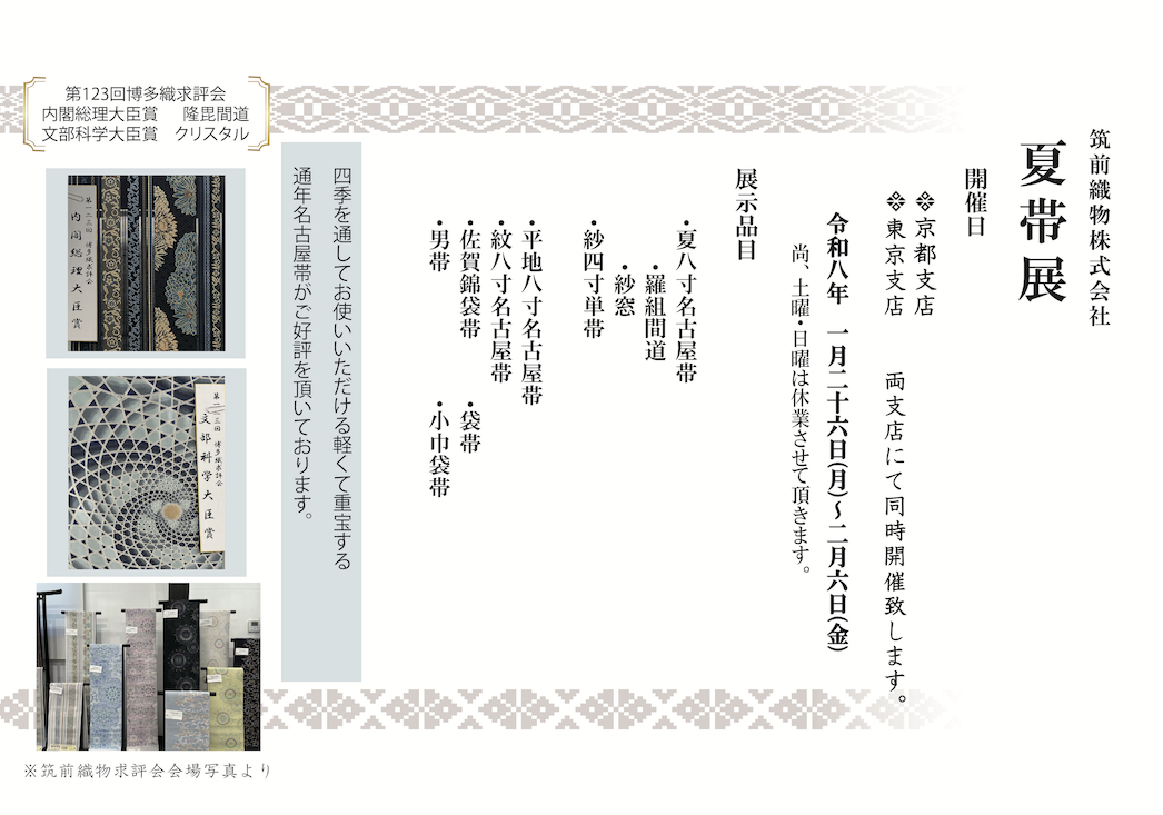 この度、筑前織物京都支店、東京支店にて「夏帯展」を開催することが決まりましたので、ご案内させて頂きます。
