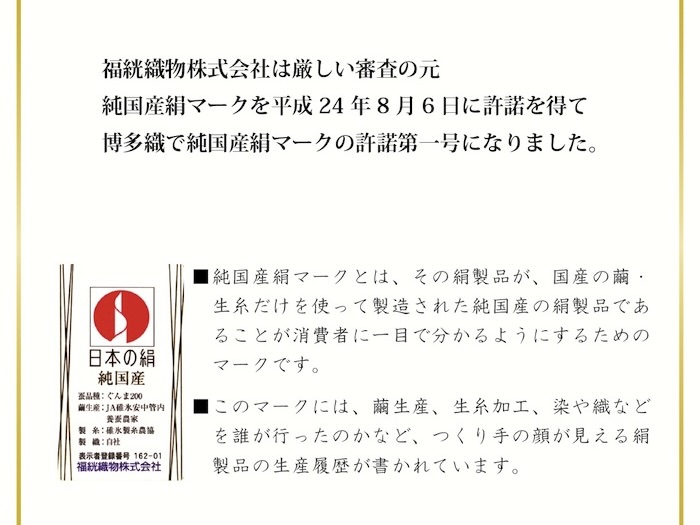 現在は、中国やブラジルの生糸を使用することが多い中、made in japanのモノづくりを行いたいと思い取得しました。この申請と特に審査が厳しく、どこの糸をどこで染色を行い、どんな商品を作った詳しく申請を行い許諾を頂きました。筑前織物の新たな挑戦として、使用していきたいと思います。