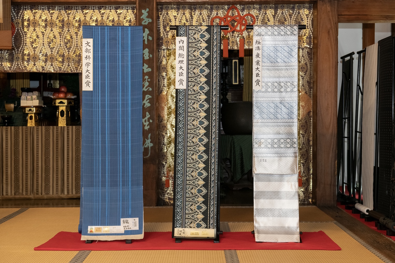 博多織工業組合主催の博多織求評会は、博多織発祥の地「承天禅寺」にて開催。一次審査には全国の問屋様、小売店様にて審査頂きます。二次審査では、有識者による一次審査の投票上位作品を審査頂き、各賞が決定されます。例年、博多織工業組合員(織元、作家)から新作の帯が約200点以上出品されます。