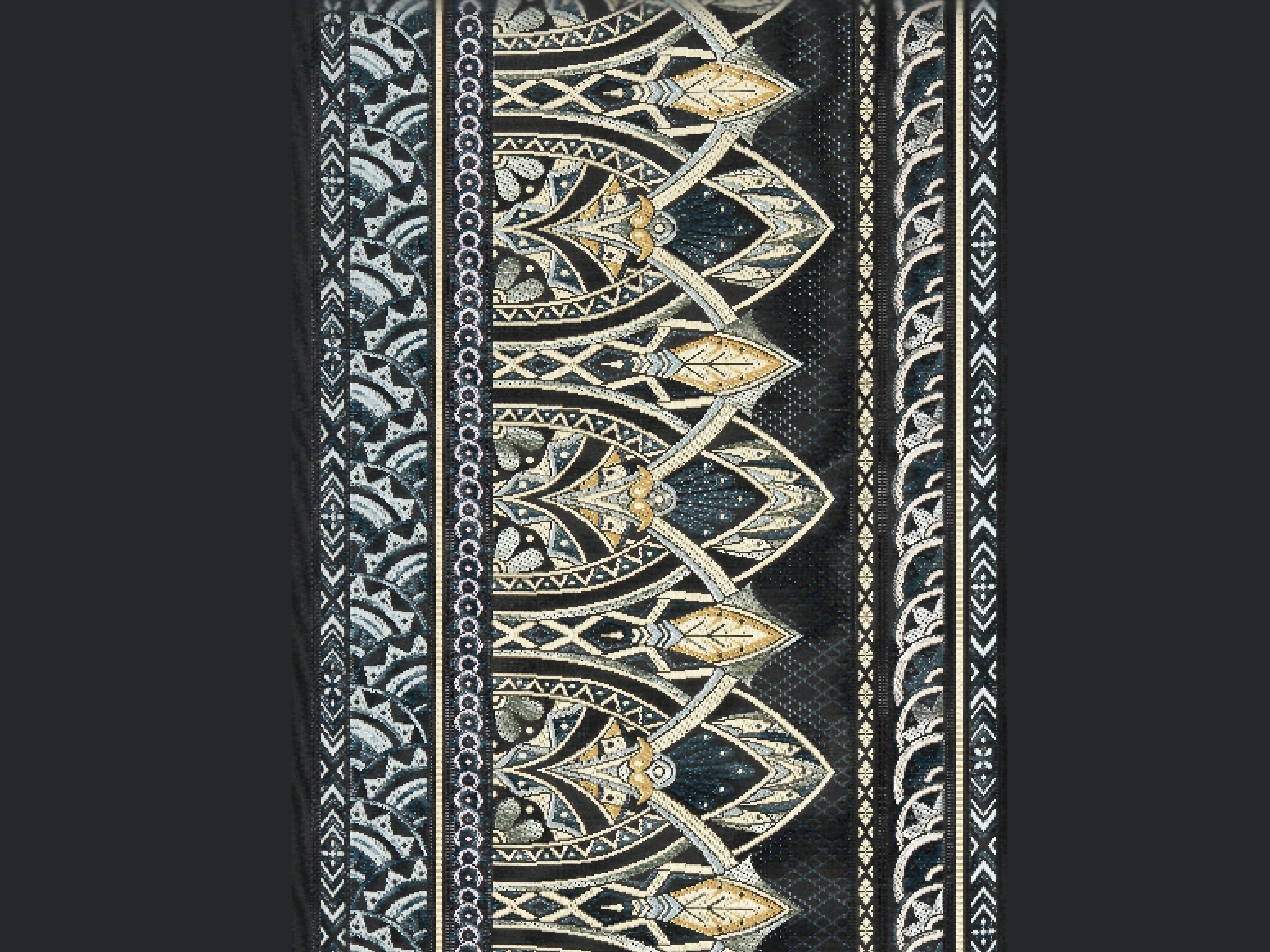 内閣総理大臣賞を受賞した七宝間道は、三原組織である平織り(ひらおり)、綾織り(あやおり)、朱子織り(しゅすおり)の3つの織組織をミックスした織表現にて、立体感や素材感などを演出しています。単色の色使いとは異なり、意匠技術によって多色使いが可能となっています。また、もじり織も加えることにとり、さらに表面に遠近感を表現しています。