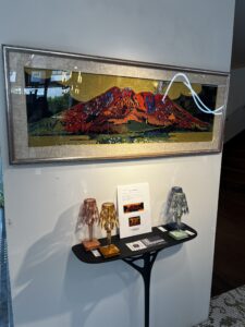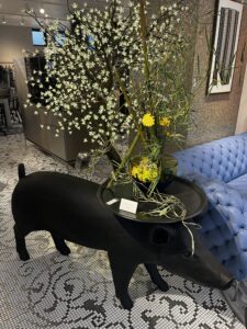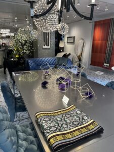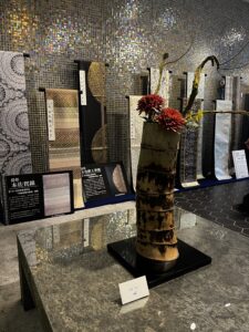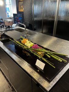 トーヨーキッチンスタイル福岡さんのショールームには洗練されたキッチンだけでなく、おしゃれなカルテルさんの照明も展示されており、今回は筑前織物の博多帯や着物だけでなく、以前からお付き合いさせていただいております、お花教室「Le Haru」の 中村晴美先生にもご協力いただき、3社での空間作りを行いました。