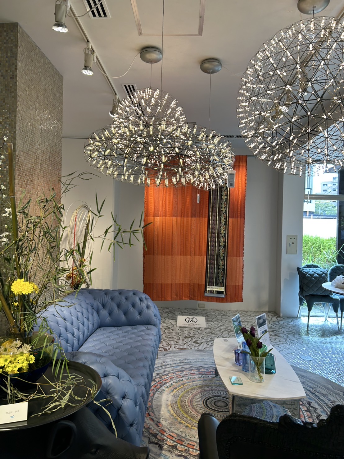 トーヨーキッチンスタイル福岡さんのショールームには洗練されたキッチンだけでなく、おしゃれなカルテルさんの照明も展示されており、今回は筑前織物の博多帯や着物だけでなく、以前からお付き合いさせていただいております、お花教室「Le Haru」の 中村晴美先生にもご協力いただき、3社での空間作りを行いました。