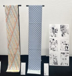 なんと、12巻で掲載された筑前織物帯「袋帯 切子」と「紋八寸なごや帯 カトルセゾン」が展示されています。この度の展示では、漫画に掲載された帯や着物が実際に漫画とともに実物が見比べる事ができる企画となっていいます。ぜひ、この機会にご覧くださいませ。